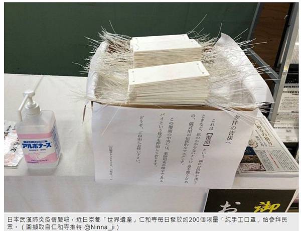 仁和寺執行長吉田正裕也表示,「說到底這不過是宗教性質的道具,但希望能藉機讓大家意識到戴口罩的重要性。」寺方所發放的紙製口罩雖無防疫效果,但有祈求藥師如來拯救世人脫離病痛的寓意,同時也提醒民眾戴口罩防疫的重要性武漢肺炎》藥師如來加持!京都仁和寺發手工口罩籲防疫 - 國際 - 自由時報電子報 https://bit.ly/3ayjftN