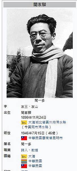 聞一多(1899年11月24日-1946年7月15日),本名家驊,字友三,湖北省黃岡市浠水縣人,中國詩人、學者、愛國主義者和民主主義者,中國現代作家。因家傳淵源,自幼愛好古典詩詞和美術。