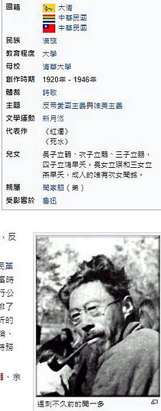 1928年出版第二部詩集《死水》,在頹廢中表現出深沉的愛國主義激情。此後致力於古典文學的研究。對《周易》、《詩經》、《莊子》、《楚辭》四大古籍的整理研究,被郭沫若稱為「前無古人,後無來者」。