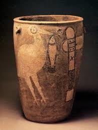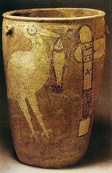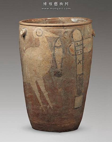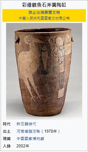 彩繪鸛魚石斧圖陶缸:屬新石器時代仰韶文化類型,1978年出土於河南省臨汝縣閻村。陶質彩繪,器高47厘米、口徑32.7厘米。陶缸繪有鸛鳥銜魚,旁邊豎立一件石斧的畫面。現藏於中國國家博物館。