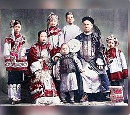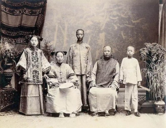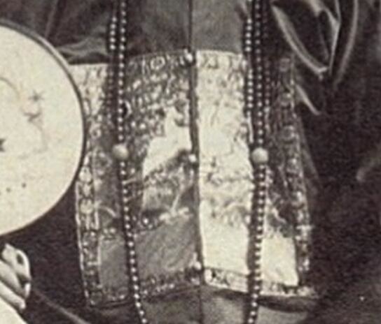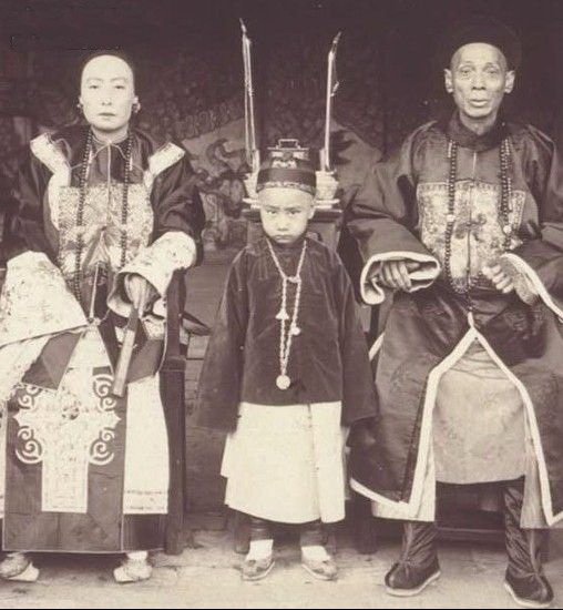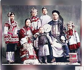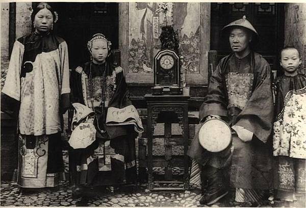 1890s年清朝 -廣州三品官全家在美國合照,氣勢十足+看不清他的頂戴跟補子,三品文官是亮藍頂跟孔雀補+這位誥命夫人的補子放最大來看,個人看四品雲雁,恭人