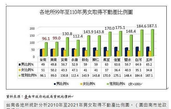 若從城鄉差距分析,都市化較高的台南所、東南所轄區,男女取得不動產的性別比例為96.1比99.0,女性取得不動產比例高於男性;其他各地所轄區,則是男性多於女性,尤其玉井所轄區,男性比例高達187.1,是性別比例差距最大地區。