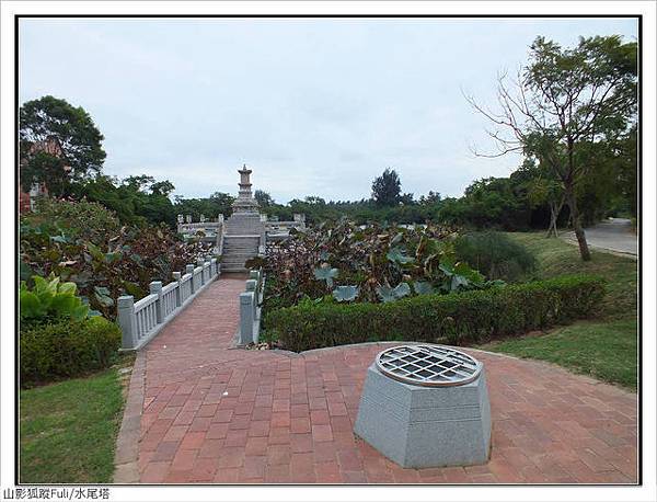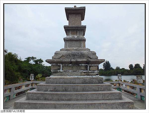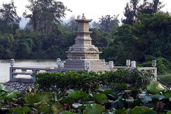 「古龍頭水尾塔 」碑文;古龍頭水塔建於清乾隆三十二年,位於雙鯉湖畔......水尾 塔是四邊形實心方塔,不同於一般佛塔的六角形或八角形造型,平面由下而上逐漸縮小,呈現出平穩的造型。塔身每上一層則有一定幅度比例縮小,在塔身最上層四面分別刻有「佛」、「法」、「僧」、「寶」四個字。塔頂再以葫蘆寶頂作為收頭,各層塔身再以突出的塔詹分隔,使塔身之間分隔更為明顯,塔身比例亦協調,線條簡單清晰。