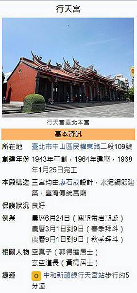 行天宮,或稱恩主公廟,主神為關聖帝君(恩主公,從神為關平太子、周倉元帥),配祀呂、張、王、岳等恩主公,是臺灣知名的關帝廟,由經營煤礦事業有成的黃玄空道長所建設而成。本宮位於臺北市中山區,又稱臺北關帝廟(如其廟籤詩上所印)或臺北武廟,繼承清代官祀的臺北關帝廟(臺北武廟)之餘緒。另有兩座分宮,位於臺北市北投區忠義山及新北市三峽區白雞山,稱「行天(宮)三宮」。其中,最早興建完成的是北投分宮,其次是三峽行修宮。臺北市區的本宮為行天三宮最晚落成者,廟門用108顆門釘代表108位神靈,即象徵36天罡星、72地煞星
