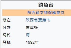 寶雞:釣魚台位於寶雞市陳倉區磻溪河上,根據記載,太公釣魚台有3處,初釣河南新安城東,繼釣陝西咸陽城西,後釣寶雞縣伐魚河谷,而三處中又以磻溪釣魚台最為有名。因為,姜太公在此垂釣的時候,遇到周文王的拜謁,輔佐朝政,才出現了中國歷史上的"文武之治"盛世。從此以後,北魏地理學家酈道元,唐代詩人李白、許渾,宋代詩人蘇軾都曾遊覽於此,並賦詩記勝。唐代的釣魚台就此建廟塑像,歷經3次重建,至今人們還可以看到"太公廟"、"文王廟"、"望賢台"、"乞子崖"、"釣魚台"等一些廟宇,祭釣堂、殿、廊、樓、台和一石馱五柏等壯觀奇景。《呂氏春秋》《水經注》有"太公釣茲泉"的記敘,民間亦有"太公背泉垂釣"、"周文王納諫邀賢"、"武吉代薪奉母"等傳說。古往今來,釣魚台就以其盛名招待遊客,宋代文學家蘇軾曾游此地,留下"夜入磻溪如入峽,照山炬火落驚猿"的名句。