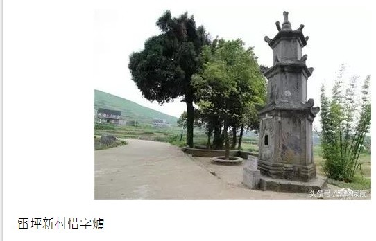 雷坪鎮新村惜字爐建於清同治三年,青石結構,形似寶塔,三層六面,現已列為市級文物保護單位。