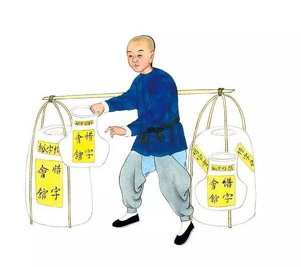 敬惜字紙造就了一種獨特的職業,我們稱之為「拾字紙的」。 拾字紙不是收破爛,直到上個世紀五六十年代我們仍能在街頭巷尾看到很多背竹簍拿火鉗拾字紙的人。 他們的衣服後背多貼著書有「敬惜字紙」四個大字的白紙。 在拾字紙的時候他們還會在頭上打個轉圈表示恭敬再放進簍裡,最後送到字紙爐焚燒,整個過程與敬神無異。
