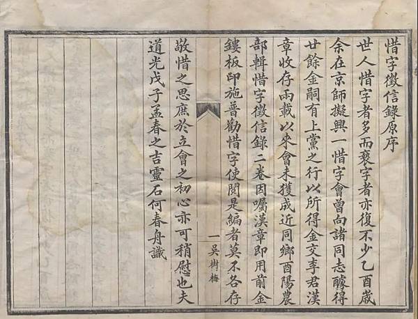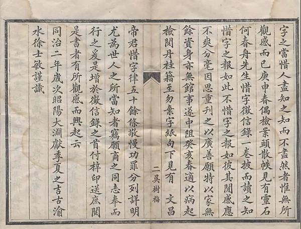 《惜字徵信錄》一刻於何君春舟,再刻於徐君士敏,皆所以廣流傳而興觀感也。 同鄉冷雲亭協戎,身嫻武備,心嗜文事,一覩是書,如獲拱璧,而又恐閱是書者未能愜意也。 爰為捐廉,凂(měi )蘇翊如農部函致京師,囑代求善書諸公,分篇繕寫,重加校刊,付之手民。 是亦勸善之一助爾。 特為誌其緣起如左。