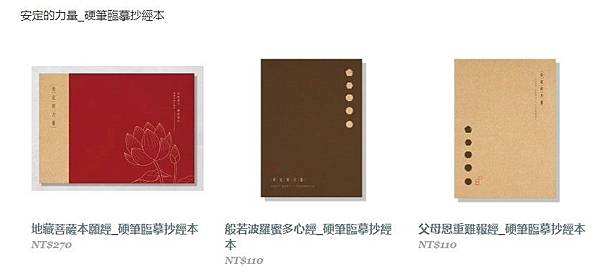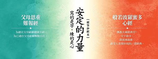 《安定的力量》糸列抄經本,共有《地藏經》、《父母恩重難報經》與《心經》。《地藏經》素有佛教孝經之譽,內容除了弘揚首善的孝道,也諄諄告誡因果之理;《父母恩重難報經》是以親情出發,這是觸動一個人內心最大的力量,也是許多更生人復歸社會最重要的支持。而《心經》則是佛教大乘經典中,文字最少,卻流傳最廣、最為大眾耳熟能詳的一部經典。