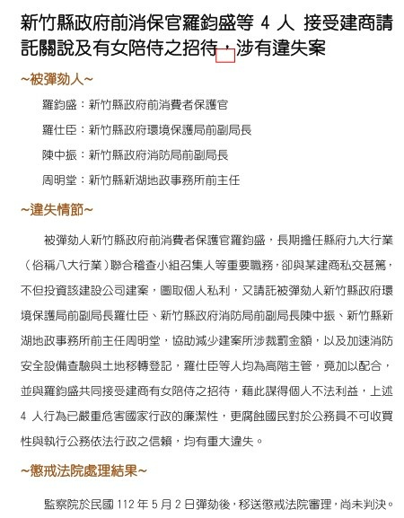 〔記者楊丞彧/台北報導〕監察院今(5)日透過新聞稿表示,新竹縣政府前消費者保護官羅鈞盛、時任新竹縣政府環境保護局副局長羅仕臣、現任新竹縣政府消防局副局長陳中振及時任新竹縣新湖地政事務所主任周明堂4人共同接受黃姓建商有女陪侍之招待,藉此謀得個人不法利益,行為已嚴重危害國家行政的廉潔性,依法提案彈劾。監察院2日審查通過提案委員蔡崇義及田秋堇所提彈劾案。經審查委員審查,通過4人彈劾案,全案移送懲戒法院審理。