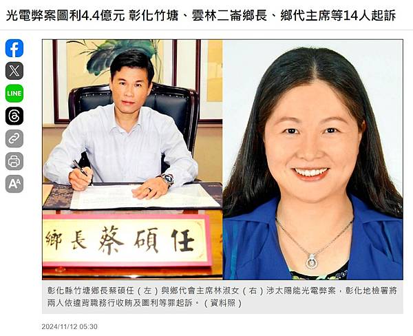 光電弊案圖利4.4億元 彰化竹塘、雲林二崙鄉長、鄉代主席等14人起訴 - 社會 - 自由時報電子報 https://bit.ly/3RQut44