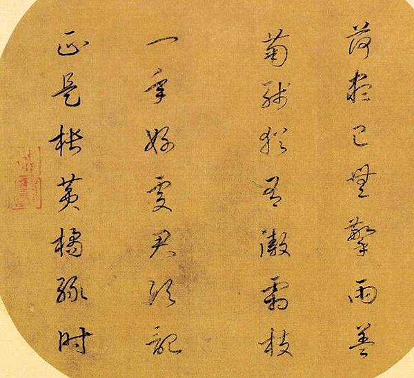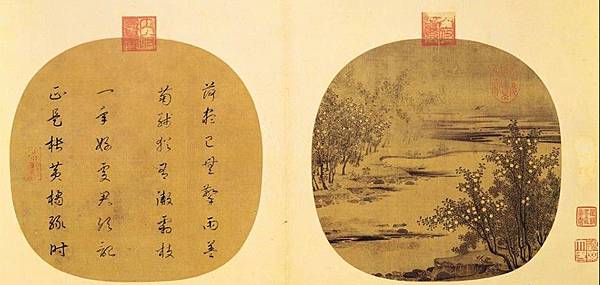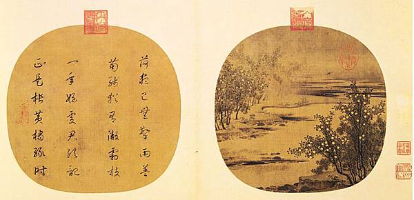 這是一首寫在宋代畫家趙令穰(活躍於西元一○七○~一一 ○○ 年)的扇面〈橙黃橘綠〉上題詩(原畫已裝裱為冊頁),原詩來自蘇東坡的〈贈劉景文詩〉,因此詩作與畫作都叫做「橙黃橘綠」。但題在扇面上的詩有個字與原詩不同,已被改過了。「正」與「最」一字之差,意境不同,感覺也不同。◇