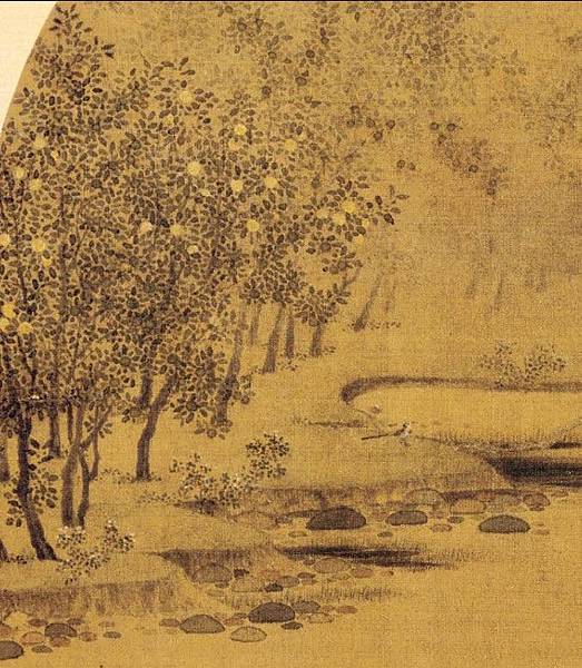 此情此景,卻是讓我想到了北宋著名文人蘇軾所寫的一句詩——「一年好景君須記,正是橙黃橘綠時」。橙黃橘綠時?橙黃橘綠圖?便不免讓人產生新的聯想,或許此詩便就是趙令穰讀後所作,又或者是蘇軾觀之有感均不好說,但這幅《橙黃橘綠圖》確是觸動人心,古樸的色調,大氣廣闊的構圖,精緻的事物刻畫,在橘樹成林,枝葉繁茂的情境下,還能將葉片進行片片渲染,在表現手法上也極其的細緻入微,在對河岸,河中碎石,河邊雜草的描繪上,雖寥寥數筆,卻也形象生動,整幅畫面雖古樸靜謐,卻高雅柔美,使人不自覺的心嚮往之,廣闊的平原,潺潺的溪流,悠遠的氣息,無一不營造出一種強烈的空間氛圍,畫風也是同樣的優雅而端麗。
