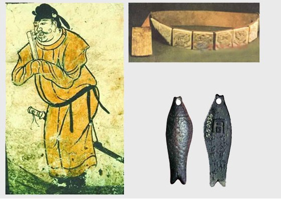 唐高宗永徽二年(651年)始,賜五品以上官員魚袋,飾以金銀,內裝魚符,出入宮庭時須經檢查,以防止作偽。武則天時,暗讖她姓武,是玄武,就是龜了,曾改佩魚為佩龜。三品以上穿紫衣者用金飾魚袋,五品以上穿緋衣者用銀魚袋,此即為“章服制度。”