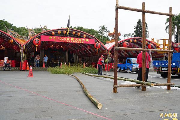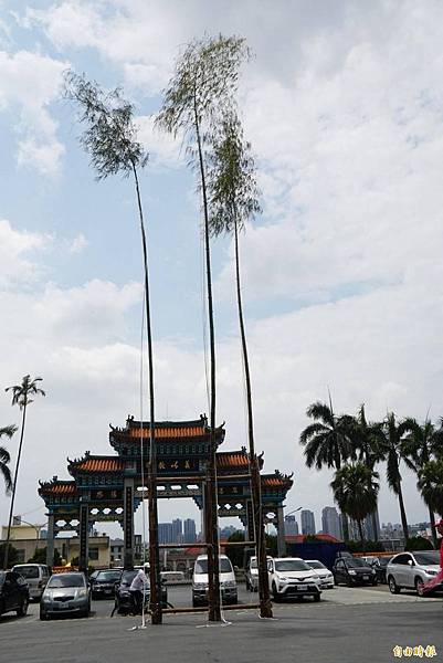 新埔褒忠亭義民廟15聯庄祭典活動,今天在廟坪廣場豎燈篙。(記者廖雪茹攝)