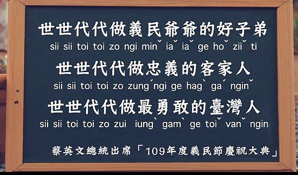 總統蔡英文:「世世代代做義民爺爺的好子弟,世世代代做忠義的客家人,世世代代做勇敢的台灣人。」