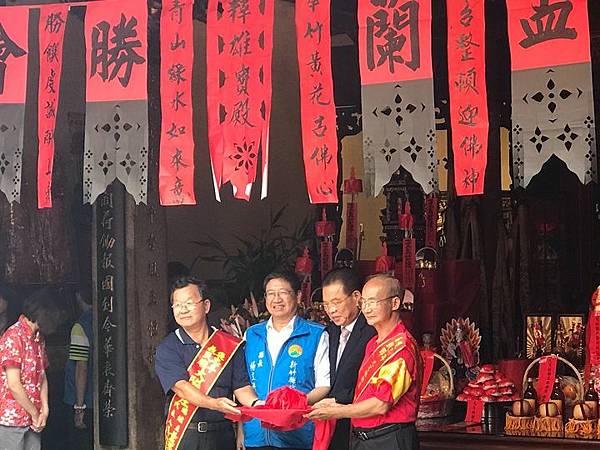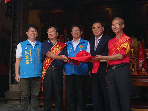 照片左起:姜義豐公號代表人姜心源、楊文科縣長、義民廟徐德馨董事長、曾捷勝公號代表人曾敬明