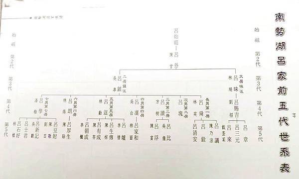 我2008年主編高雄田寮月世界南勢湖呂家族譜,把歷代女性找得到名字的,包括歷代祖公祖嬤中的祖嬤女祖先,及外嫁或未嫁的族人,.都編入族譜系統表,與一般民間族譜都只記載歷代男性系統,看不到一個女性的族譜,不相同,被稱為族譜首創先例。