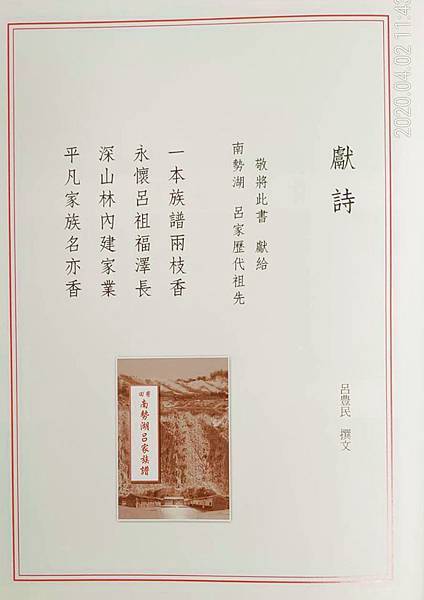 高縣田寮鄉七星村南勢湖呂家古厝已有百餘年歷史,上千名族人目前散居世界各地,由於家族沒有固定慶典聚會,後代子孫往往相見不相識,令第八代族人呂豐民、呂正心感慨萬千,2人歷經2年時間搜集、整理資料,編撰完成「田寮南勢湖呂家族譜」,藉此喚起族人對家族的認同。