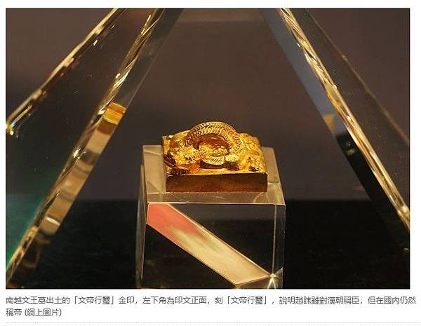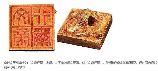 南越文王墓出土的「文帝行璽」金印(編號D79),左下角為印文正面,上刻有「文帝行璽」四字,說明第二代南越國君主趙眜雖然對漢朝稱臣,但在國內仍然稱帝