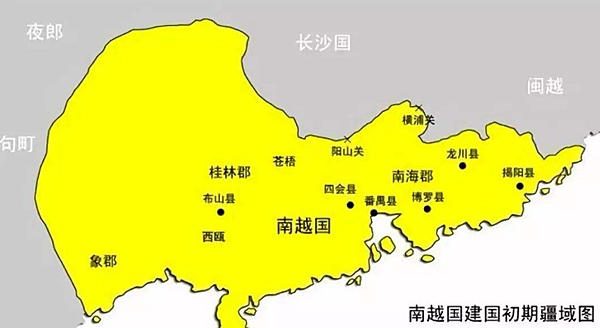 南越開國之君趙佗恆山人,原為秦朝的將領,公元前219年秦軍南征百越,趙佗任副將;公元前214年嶺南併入秦王朝,在廣州設南海郡,趙佗任龍川令,秦末天下大亂,趙佗領軍割據一方,後代行南海郡尉。公元前203年因邊禁問題與呂雉交惡,建立南越國,自稱南越武王,以廣州為都城。數敗漢軍,吞併閩越、西甌、駱越,聲威很盛。