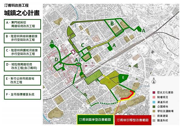 都市發展處代理處長許志瑞表示,汀甫圳通學步道工程最大亮點,是將原來周遭住戶的地上佔用物完全清除,打開水圳後,沿線串聯起汀甫圳沿線自學府路至寶山路串起共1.4公里的城市綠廊,沿線設置座椅、活動平台、廣植樹木及植栽,最特別是設計跨圳便橋,美學提升同時更兼具便利性。