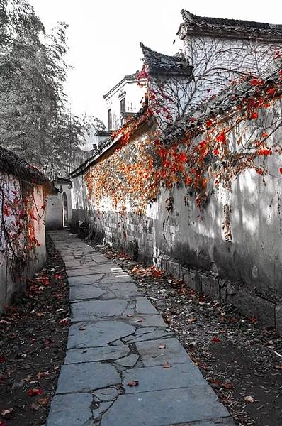 黑和白,化作徽州的滄桑,讓徽州的號脈顯得古樸而又蒼茫。這是屬於徽州的印象,然而徽州的印象不只是黑白的渾厚,還有那點綠的溫馨,因為,黑是家的瓦,白是家的牆,在牆的裡頭,是徽州人的生活故事。
