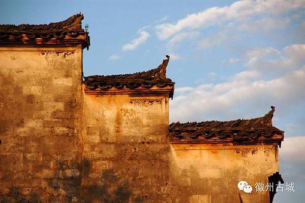 徽州在一些大的民居建築上,採用了大屋頂脊吻,這沿襲的是宋代官式營造法,大屋頂脊吻有正吻、蹲脊獸、垂脊吻、角戧獸、套獸等,除了裝飾需要,還附會了不少神話傳說。徽州民居是點、線、面的巧妙組合,而黛瓦、粉壁、馬頭牆這三者,應該是徽州古民居外部造型的三大特徵了。