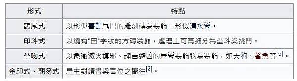 按「座頭」(即「馬頭」)分,有「鵲尾式」、「印斗式」、「坐吻式」等多種,視房主的愛好、財富、身份、地位的不同而異。