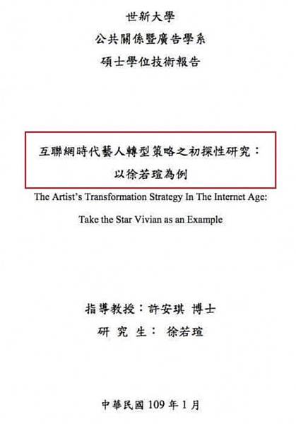 一名網友日前於《批踢踢實業坊》以「有沒有徐若瑄論文的八卦?」為題爆料,他貼出徐若瑄今年1月完成的碩士論文封面照,從中可見論文題目為「互聯網時代藝人轉型策略之初探性研究:以徐若瑄為例」,「研究自己」的論文內容遭部分網友質疑,「自己寫自己,根本自傳」、「這是論文還是學期作業。」