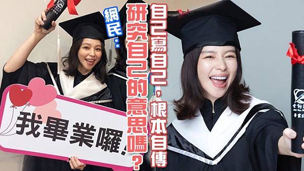 台灣藝人徐若瑄,為完成自己人生夢想,早年在上海MBA報讀境外碩士課程,她曾表示要照顧家庭,又要讀書做功課感到疲憊不堪,不過苦讀三年,徐若瑄去年終於取得學位,更榮獲「傑出表現獎」。可是,近日徐若瑄的畢業論文封面被網民公開,發現其研究對象竟然是自己,引發討論。有人留言揶揄徐若瑄「自己寫自己,根本是自傳」,有人笑這篇論文只能當學期作業,亦有人指研究自己根本無意思。