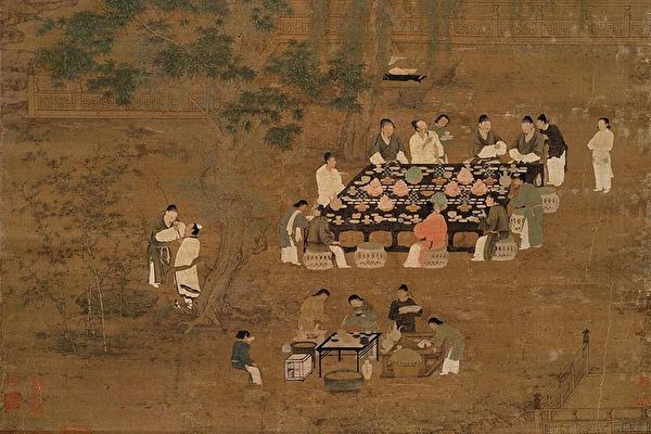 宋徽宗《文會圖》,茶几上備茶的茶盞是青黑色的。(飛鴻踏雪/大紀元)
