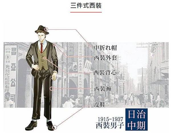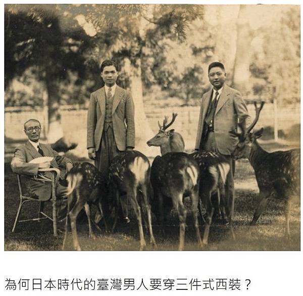 受過日本新式(西式)教育的臺人,更容易全面接受西式服裝,也因此在相片中,很常看見他們以全套西裝的形象留下身影。當年的正裝大多還會加上一件背心,成為三件式(three-piece suit)西裝,講究一些還會別上領棍、胸針等等。