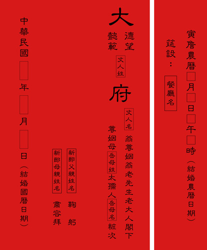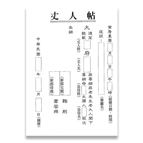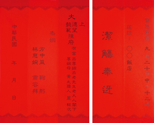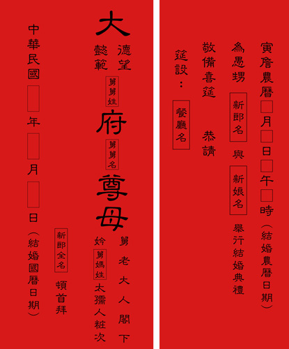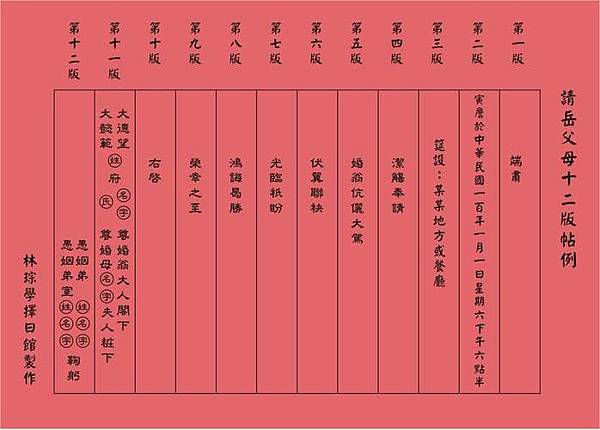 帖子上具備的元素如下,將之套用到制式的親家帖,最後再以國曆的宴客日期作為結尾: