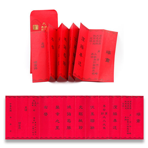 一般來說,十二版帖是寬約20公分、長約60公分的紅紙黑字摺帖,會一正一反地摺成12摺,就像古時候的帖子一樣。