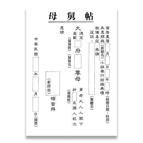 母舅帖會具備的元素和親家帖相似,分別有下列元素,最後同樣寫上國曆的宴客日期作結: