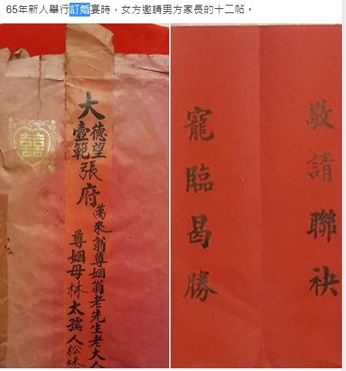 65年新人舉行訂婚宴時,女方邀請男方家長的十二帖。母舅帖寫法+親家帖/丈人帖寫法
