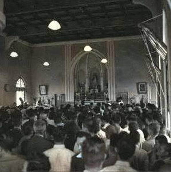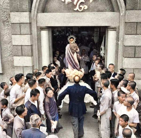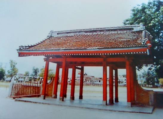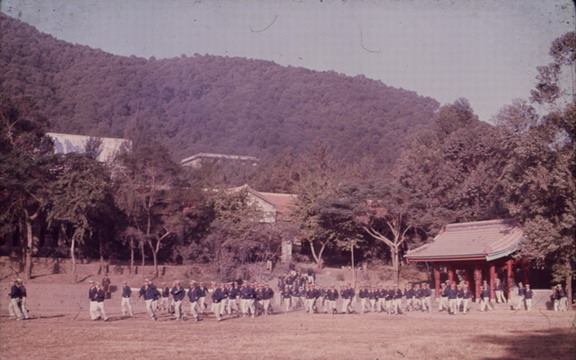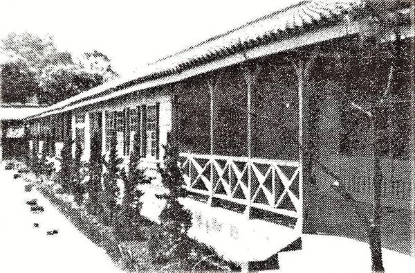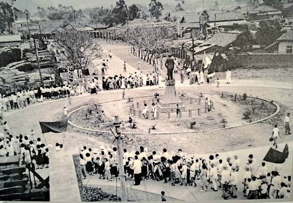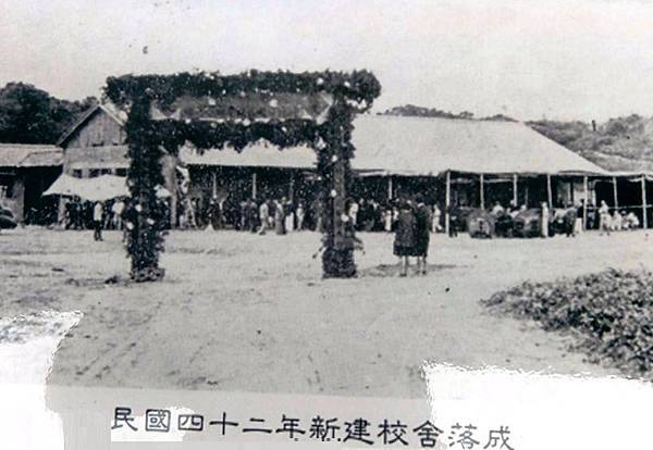 竹東高中的紅門-民國五六零年代,右側紅門是操場的入口,左上角為當時的大禮堂(現資源教學中心)。
