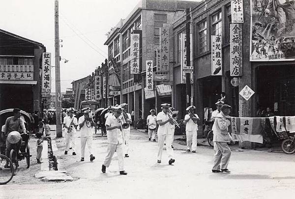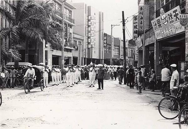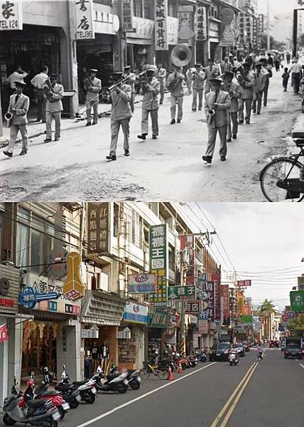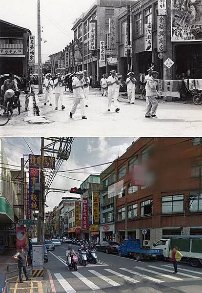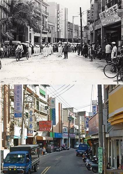 長春路與大同路口,一直是地段好的鬧區。目前,僅有圖正中的彰化銀行至今迄立不搖,其隔鄰,往商華街方向的老房子,立面很美,拆掉可惜,其中的「日新冰果室」,為著名的製冰廠,兼賣冰豆乳四果冰等,附有座位,是青年男女聊天約會好所在。在還有三輪車的年代,「東源汽車行」也快速提供轎車出遠門。圖左的「紅天夢酒家」,室內燈光常呈七彩。圖右的街角樓上,也是電影看板必爭之地。(照片提供者-鄭明琪團友)
