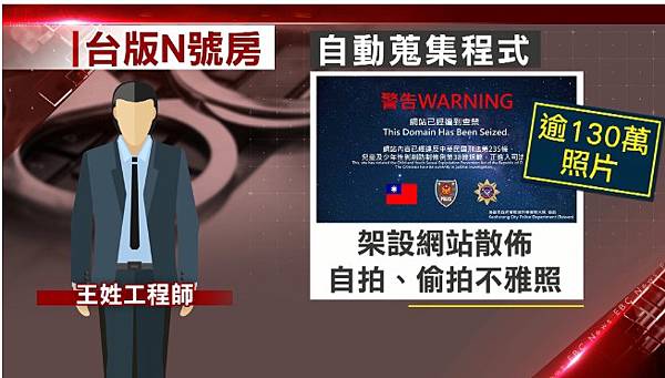 類似南韓N號房事件的情節延燒到台灣,高雄與台北警方聯手逮到在台北架設網站的王姓工程師,他寫自動化蒐集程式,在網站散布自拍和偷拍不雅照,有多達130萬張照片,受害女子眾多。台灣展翅協會陳時英表示:「裡面的內容是以年輕的女孩為多的,而且當時的內容是可見是有私密處的裸露。」