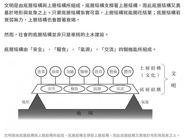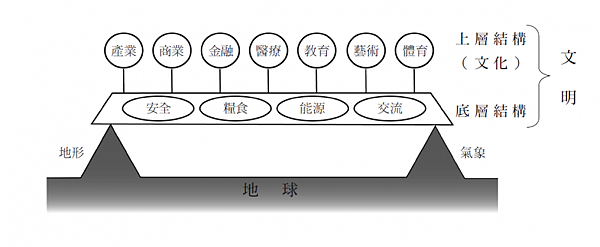 文明是由底層結構與上層結構所組成,底層結構支撐著上層結構,而此底層結構又奠基於地形與氣象之上。只要底層結構紮實可靠,上層結構就能開花結果;底層結構若衰弱無力,上層結構也會跟著衰竭。