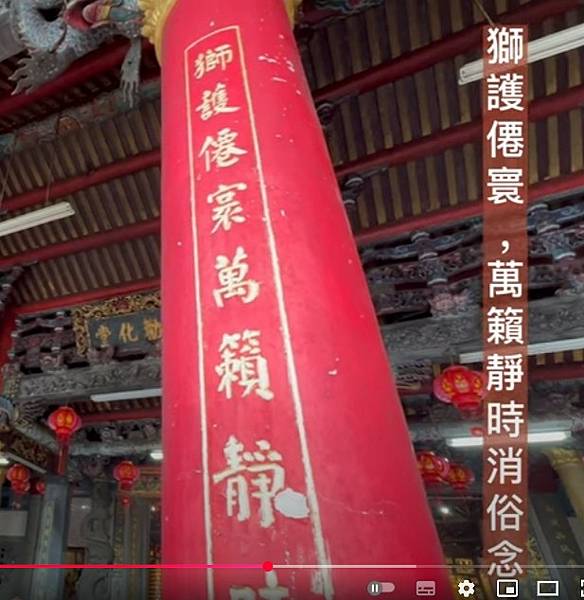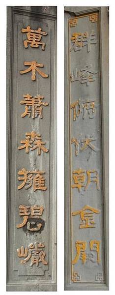 廟前一對石獅後的對聯:「萬木蕭森擁碧巗,群峰俯伏朝金闕。