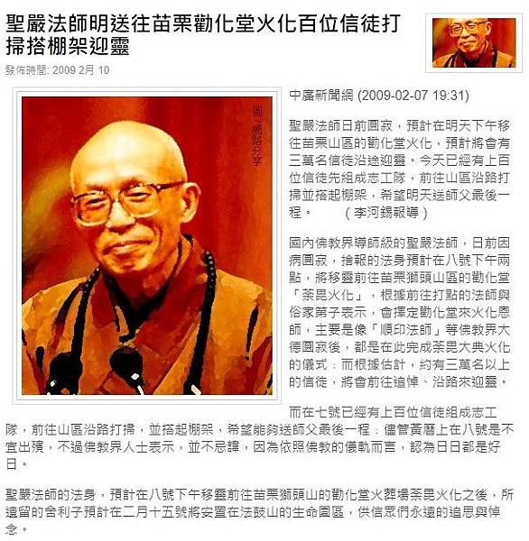 國內佛教界導師級的聖嚴法師,日前因病圓寂,捨報的法身預計在八號下午兩點,將移靈前往苗栗獅頭山區的勸化堂「荼毘火化」,根據前往打點的法師與俗家第子表示,會擇定勸化堂來火化恩師,主要是像「順印法師」等佛教界大德圓寂後,都是在此完成荼毘大典火化的儀式﹔而根據估計,約有三萬名以上的信徒,將會前往追悼、沿路來迎靈。