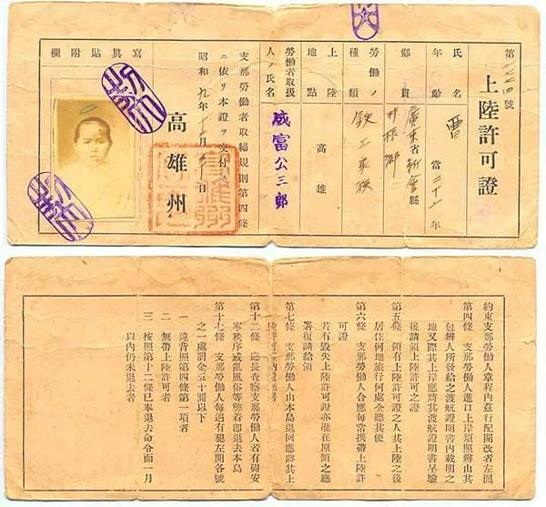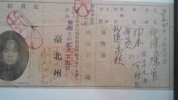 昭和9年(1934年),中華民國人民到日本國台灣當支那勞働人(移工)的上陸許可證