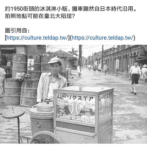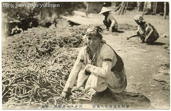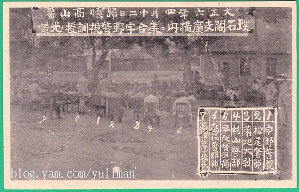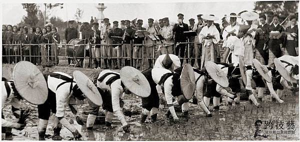 總督向日本昭和天皇納貢米插秧儀式--照片位置在台中市農業改良場,現今的大墩文化中心,照片裡有日本女人穿整齊和服,裏頭也有日本祭司,儀式完後,也跟著下去插秧,儀式有樂隊、學生,春天時早早插秧,秋天收割時也要經過一樣的儀式。收割後,進行甩穀動作後,請未婚女生戴手套一粒粒挑選米粒,不能有裂痕,進行分類篩米的動作,進貢給日本天皇,表示總督對日本天皇的效忠。