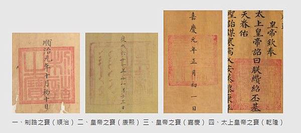 皇帝之寶三方:一方青玉質,交龍紐,滿本字文漢篆文;一方碧玉質,盤龍紐,滿本字文漢篆文;一方檀香木質,素紐,滿篆文。