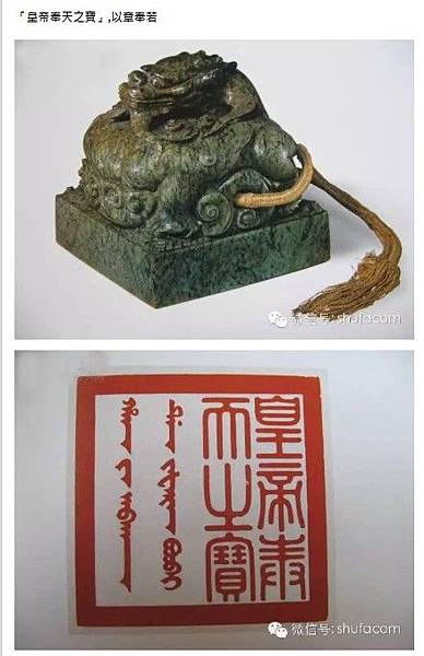皇帝奉天之寶:《交泰殿寶譜》以章奉若,碧玉質,盤龍紐,漢篆文、滿本字文,郊祀用璽。