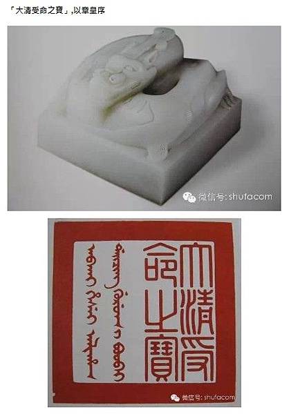 大清受命之寶:《交泰殿寶譜》以章皇序之用,白玉質,盤龍紐,漢篆文、滿本字文,昭告天下天子登基用璽。