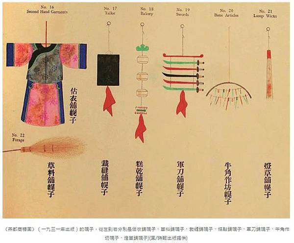 《燕都商榜圖》(一九三一年出版)的幌子,從左到右分別是估衣鋪幌子、草料鋪幌子、裁縫鋪幌子、糕點鋪幌子、軍刀鋪幌子、牛角作坊幌子、燈草鋪幌子)(圖/時報出版提供)