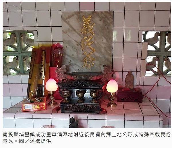 南投縣水沙連社區大學埔里分校近期展開宗教歷史巡禮,發現舊稱「舂粿坑」成功里義民祠義民爺牌位旁,還有1尊土地公泥像,考究才知祂是被當地村民「拜錯」50年的神明苦主,最終也將祂留置祠中共享香火至今,成地方文史軼聞。